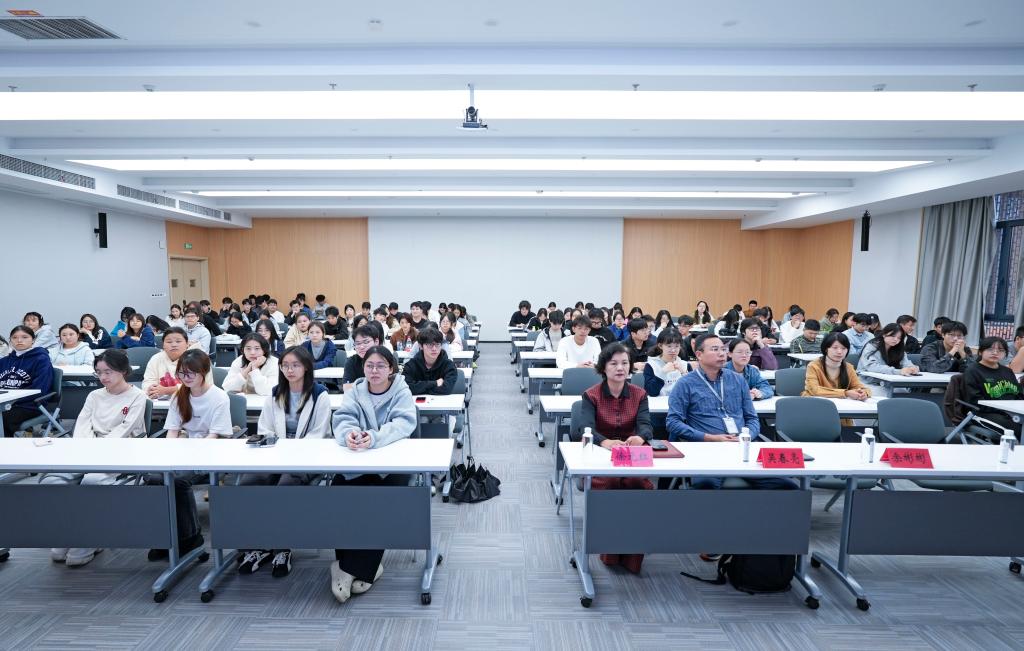 在企业分享环节,天宇药业总裁助理兼总裁办主任吴春亮详细介绍了公司发展历程、核心业务及行业布局,并从企业用人需求出发,解读了医药化工领域人才应具备的核心素养。人力资源中心招聘负责人虞跃则聚焦实践班政策细节与专属福利进行了全面细致的解读。现场设置的提问交流环节中,企业代表耐心回应学生问题,互动氛围热烈。仪式结束后,实践班现场面试在指定场地同步开展,为学子搭建了快速对接企业的绿色通道。