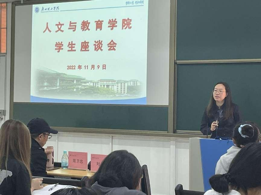 11月9日,人文与教育学院在7栋408召开学生座谈会,院长周卫忠、文学系主任汪美葵出席本次会议,22级新生班级学委和学生代表参会。