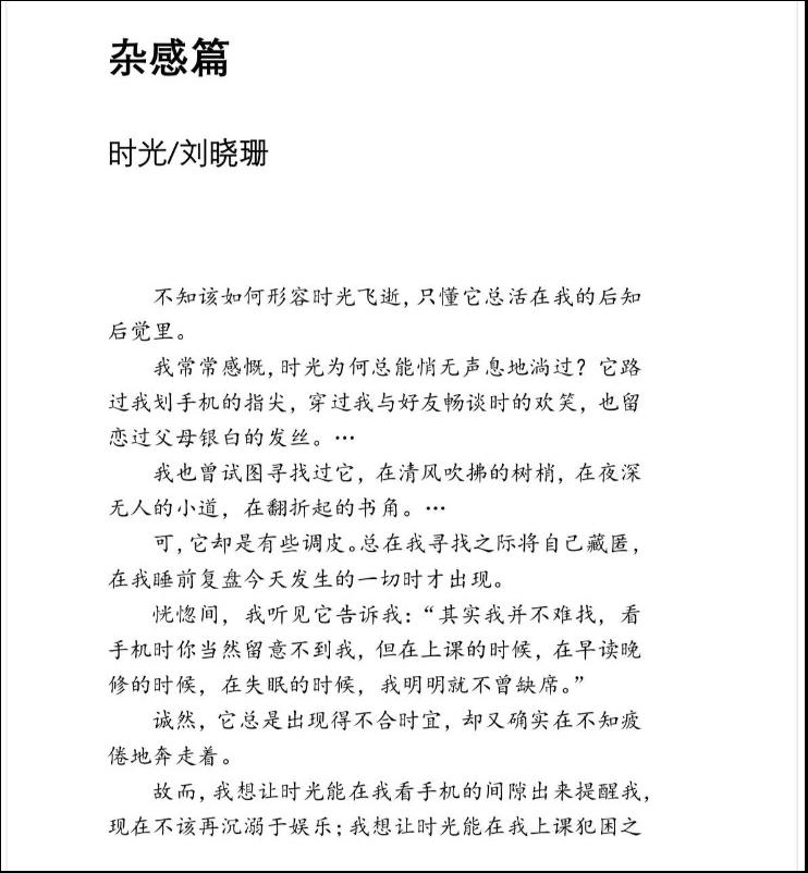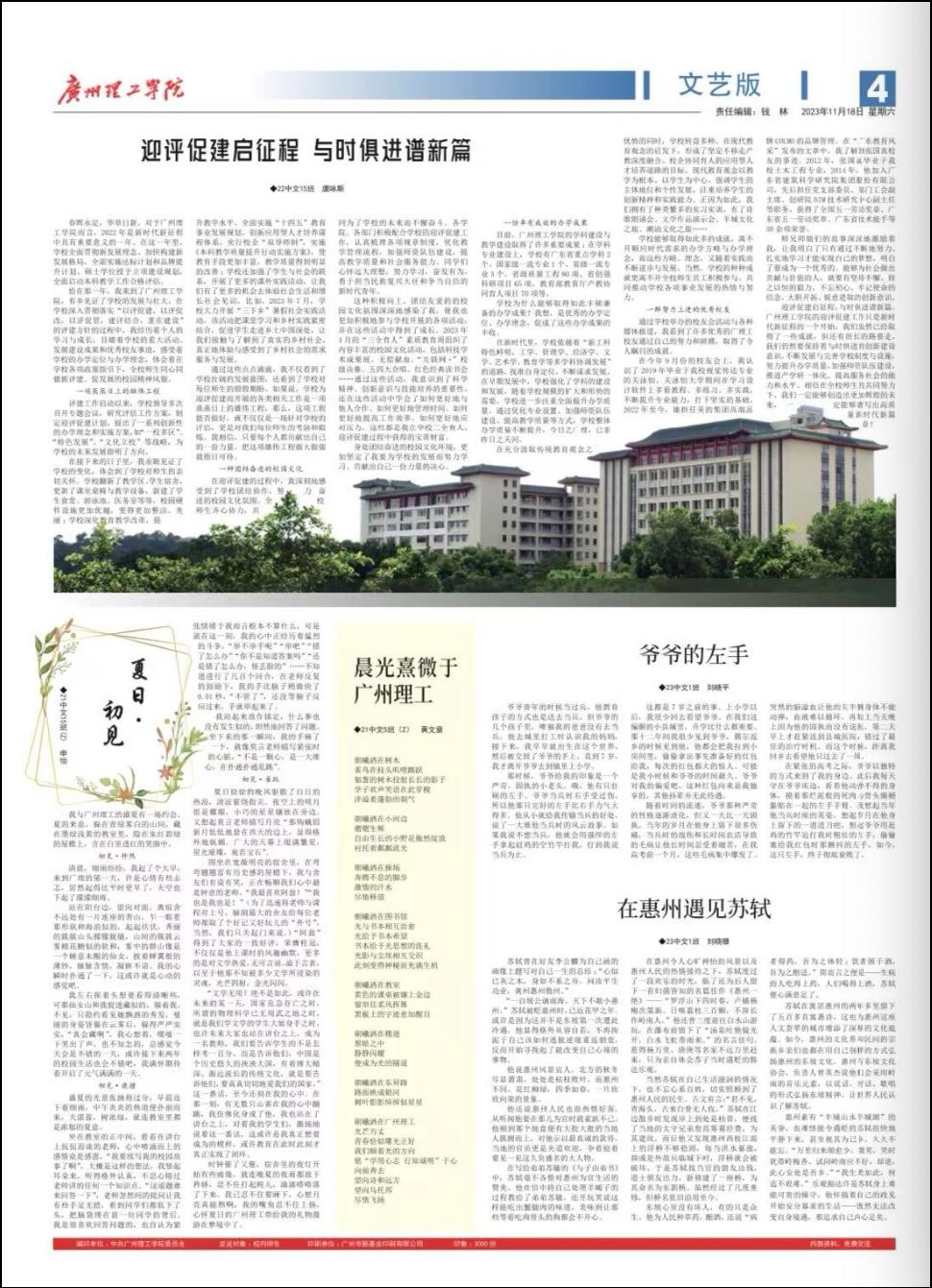 刘晓珊同学散文《又一年秋,寄情于月》发表于2024年9月11日 深圳市宝安日报;散文《书香满溢成长路》2025年5月12日发表于深圳市宝安日报;诗歌《时光》入选《龙华文艺》第一辑(2023年10月5日);散文《在惠州遇见苏轼》发表于2023年12月8日广州理工学院校报文艺版。