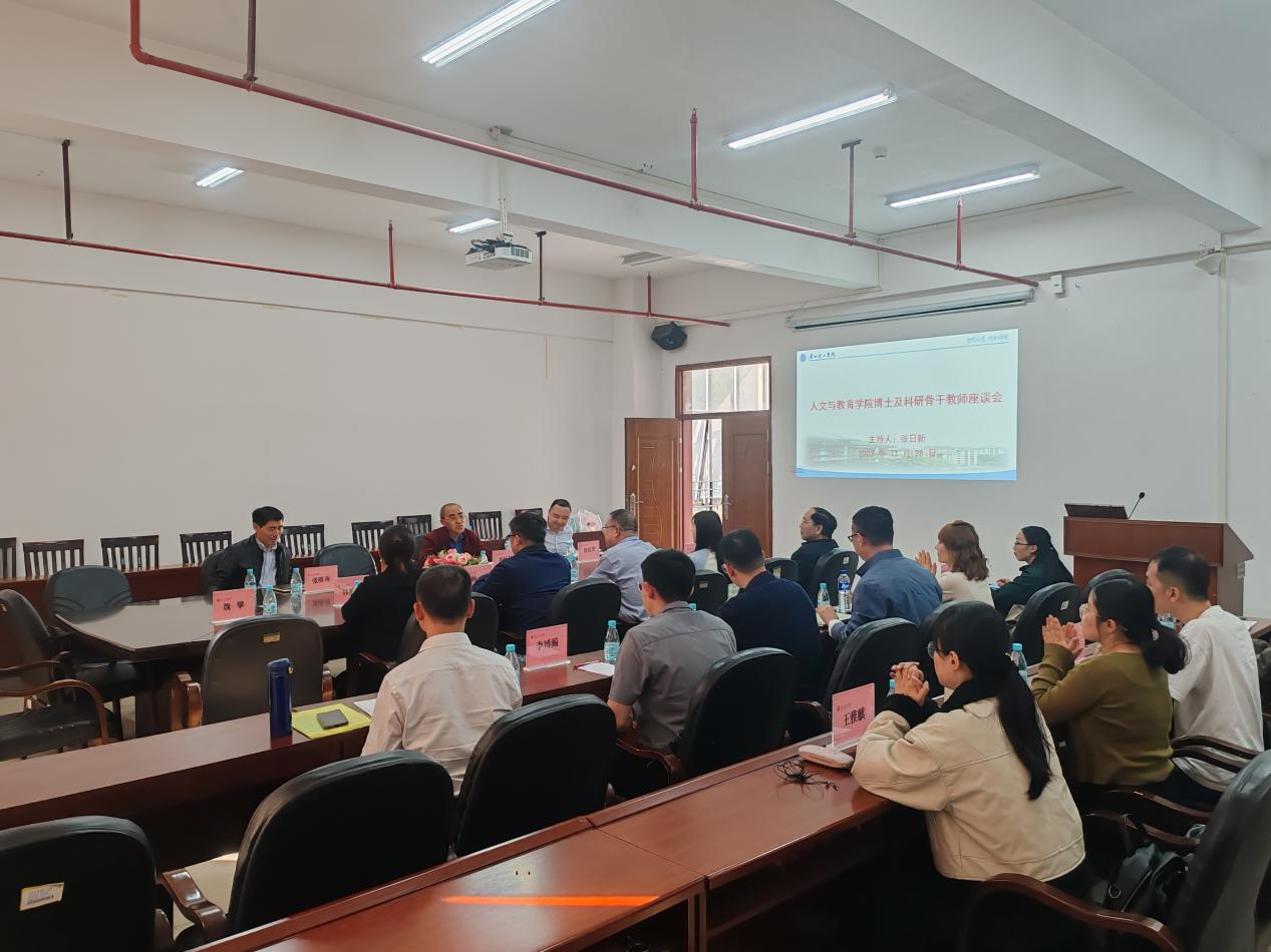 2023年11月28日下午,人文与教育学院博士及科研骨干教师座谈会在行政楼201会议室成功召开。座谈会旨在加强学校科研规划部门和人文与教育学院的沟通,针对学院科研发展等方面的问题进行交流和探讨,以促进学术合作与创新,进一步提升学院的教育教学和科研水平。