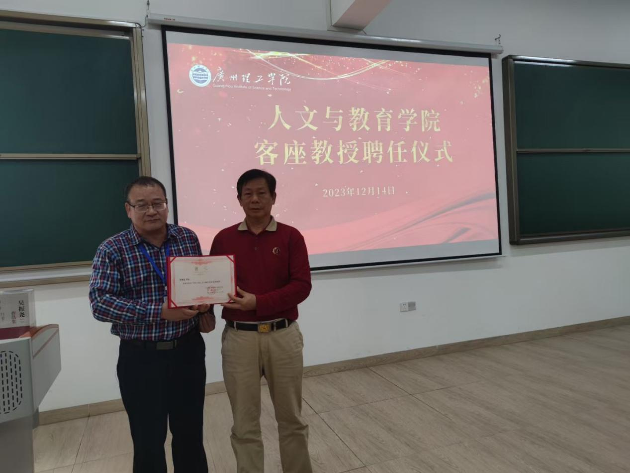 讲座前,广州理工学院党委副书记、副校长肖海等校领导亲切会见了讲座嘉宾一行。陈南先教授代表人文与教育学院为吴振尧先生颁发客座教授聘书。吴振尧先生、周后运先生为我校图书馆捐赠了个人著作。