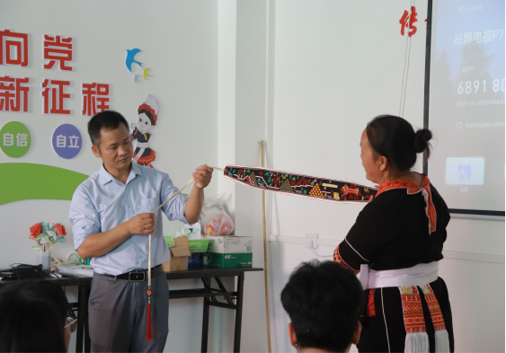 房伟艳老师将瑶绣与日常生活用品、饰品相结合,致力于让瑶绣更贴近大众生活。同时,房伟艳慷慨表示,愿意免费教授学生们学习瑶绣技艺。沙腰妹(瑶妹)唐琪则向学生们详细讲解了未婚女子的服饰艺术以及瑶族的婚恋习俗。