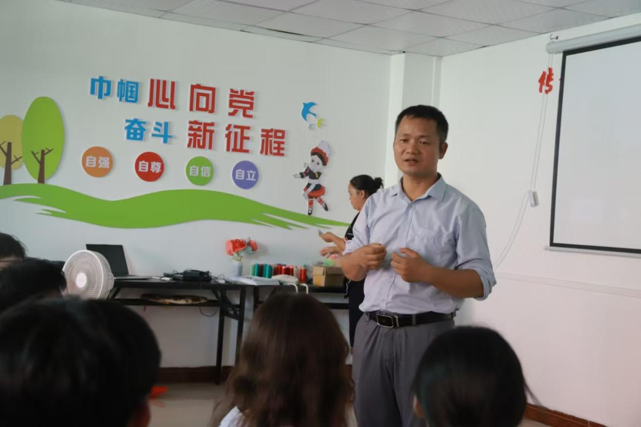 覃守达老师在房伟艳瑶绣技艺研学开始前介绍瑶族及其刺绣历史以及此次研学目的和内容