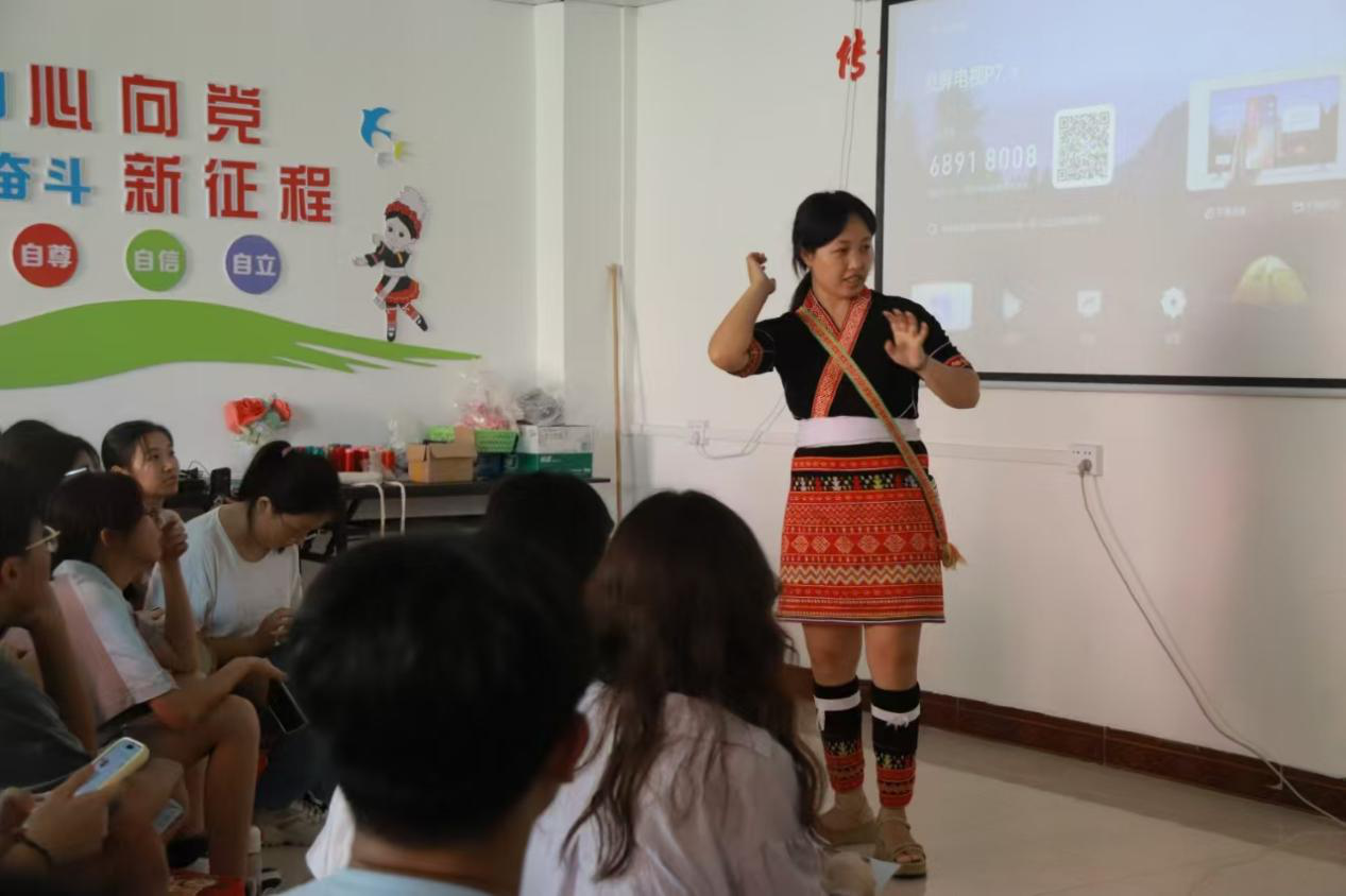 沙腰妹(瑶妹)唐琪给同学们讲解瑶族未婚女性的服饰艺术