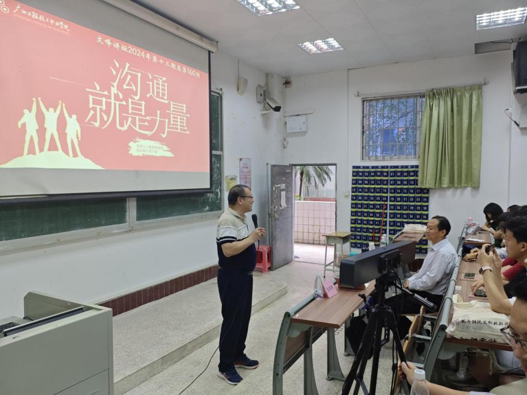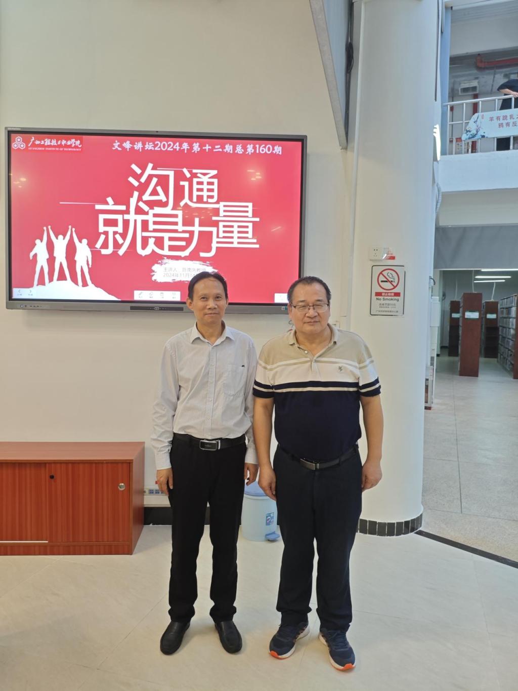 2024年11月14日下午2;30-4:30,我校人文与教育学院陈南先教授受邀在广州工程技术职业学院从化校区实训一号楼103室作题为《沟通就是力量——漫谈口才、演讲与人生的关系》的专题讲座。出席讲座活动的有广州工程技术职业学院图书馆程大立馆长、外语与商贸学院张明辉院长及图书馆的相关教师。