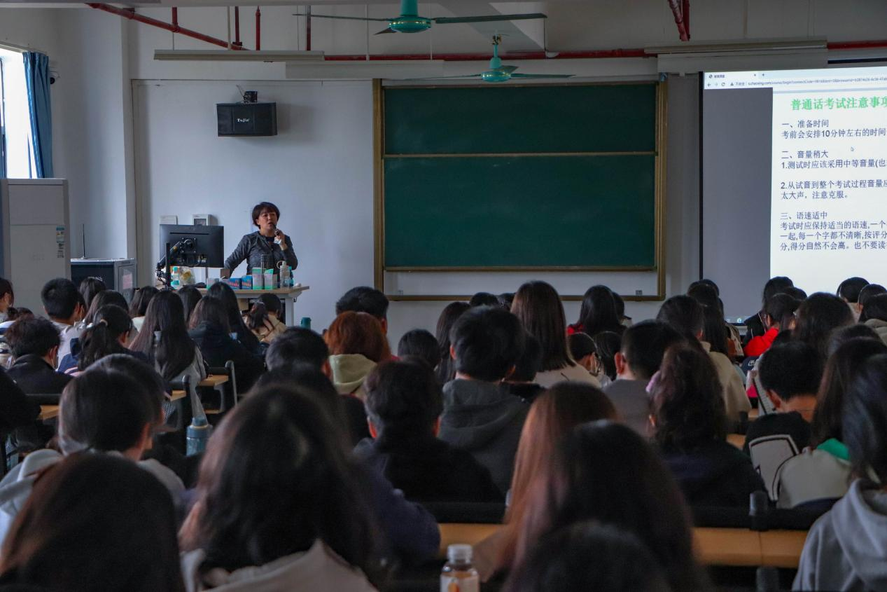 胡老师介绍了普通话的含义。“普通”即普遍共通之意。普通话是现代汉民族的共同语言,同时也是国家法定的全国通用语言。胡老师分享了同学们最关心的普通话水平测试内容、考试注意事项及考试技巧。她表示,普通话水平测试由读单音节字词100个、读双音节词语50个、400字短文朗读、说话四部分构成,同学们要不断通过听、说、读、写,掌握朗诵和演讲的基本表达技巧,提升自身的普通话水平。胡老师强调,普通话测试是国家推普工作的重要组成部分,有利于使推普工作走向科学化,规范化,制度化。