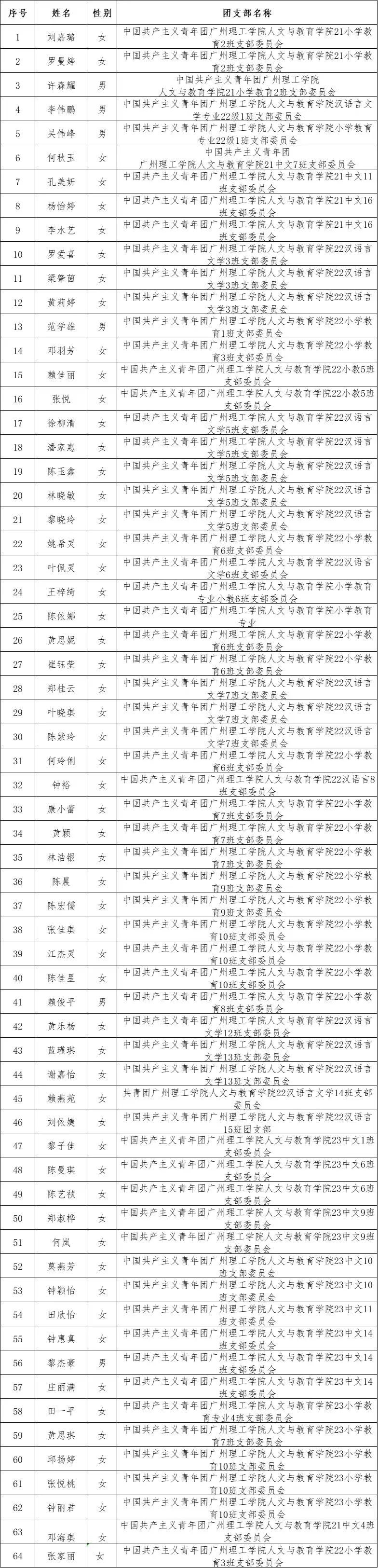 为深入学习贯彻党的二十大精神,落实习近平总书记关于青年工作的重要思想,表彰先进、树立典型,进一步组织动员学校各级团组织和广大团员青年不忘跟党初心、牢记青春使命,不断提升团组织的组织力、引领力、服务力和大局贡献度。人文与教育学院举行评选2023—2024年度优秀共青团员、团干部,现公示结果如下。公示时间为2024年4月14日至4月16日。如有异议,请以书面形式向人文与教育学院办公室7-620反映。反映情况需自报或签署真实姓名,要有具体事实,不报或不签署真实姓名以及不提供具体事实材料的一律不予受理。