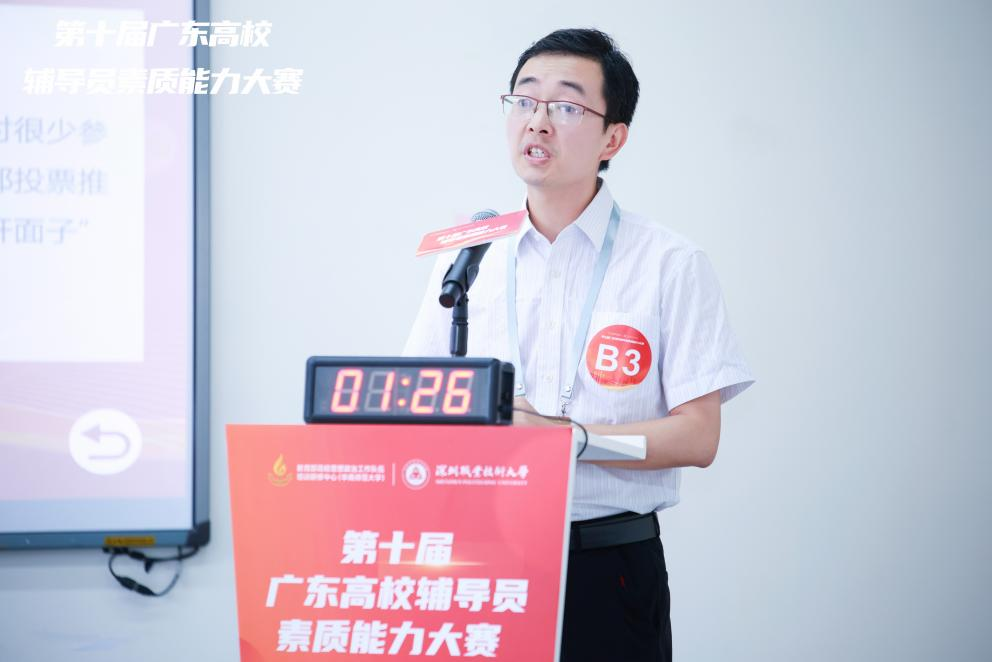 5月29日至31日,由广东省教育厅主办,教育部高校思想政治工作队伍培训研修中心(华南师范大学)、深圳职业技术大学共同承办的第十届广东高校辅导员素质能力大赛在深圳职业技术大学留仙洞园区举行,共有来自全省136所高校的136名选手同场竞技。我院辅导员老师陈新喜参赛,荣获大赛三等奖。
