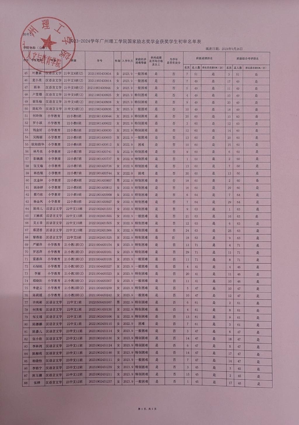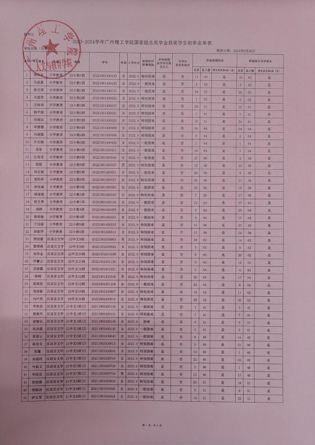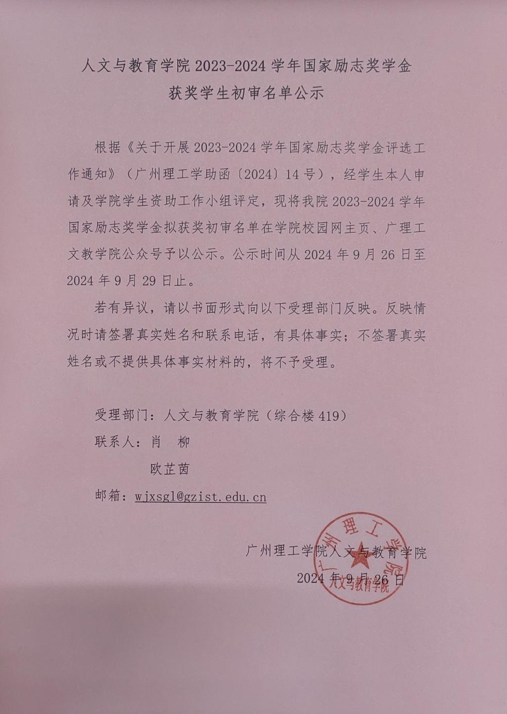 根据《关于开展2023-2024学年国家励志奖学金评选工作通知》(广州理工学助函〔2024〕14号),经学生本人申请及学院学生资助工作小组评定,现将我院2023-2024学年国家励志奖学金拟获奖初审名单在学院校园网主页、广理工文教学院公众号予以公示。公示时间从2024年9月26日至2024年9月29日止。