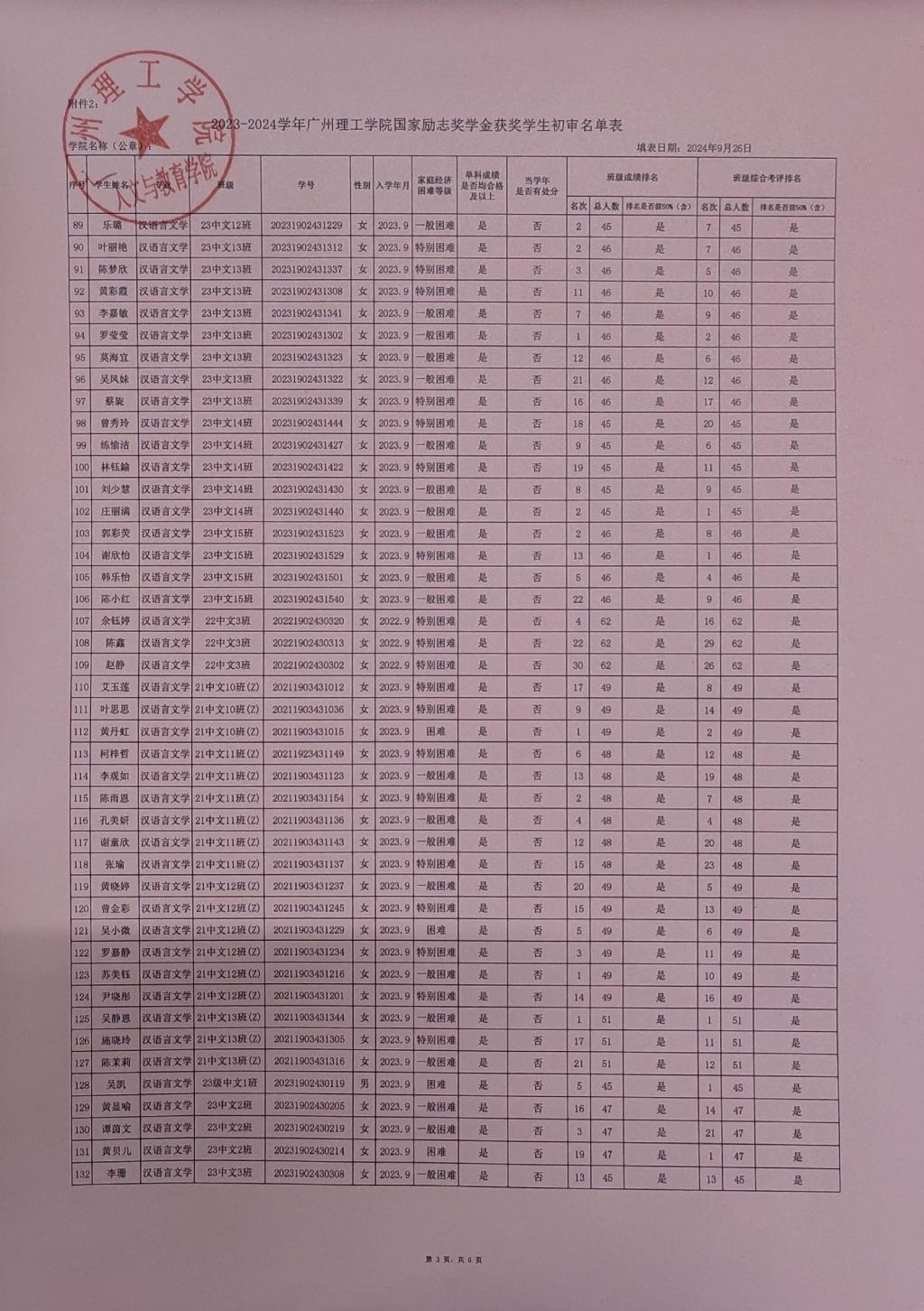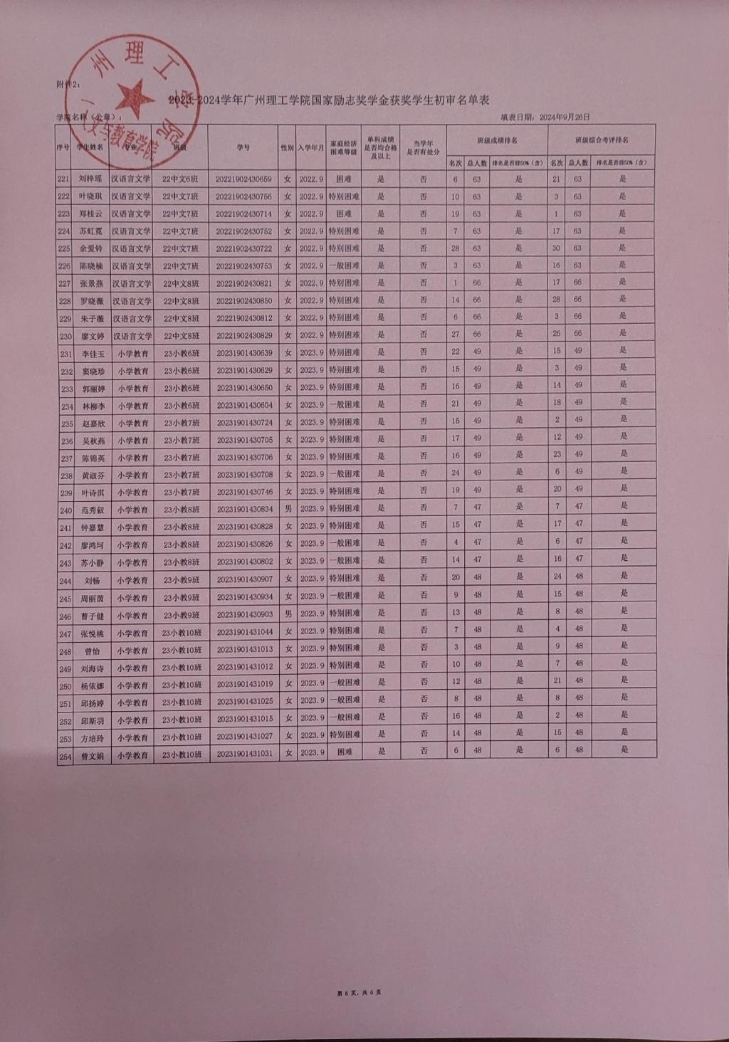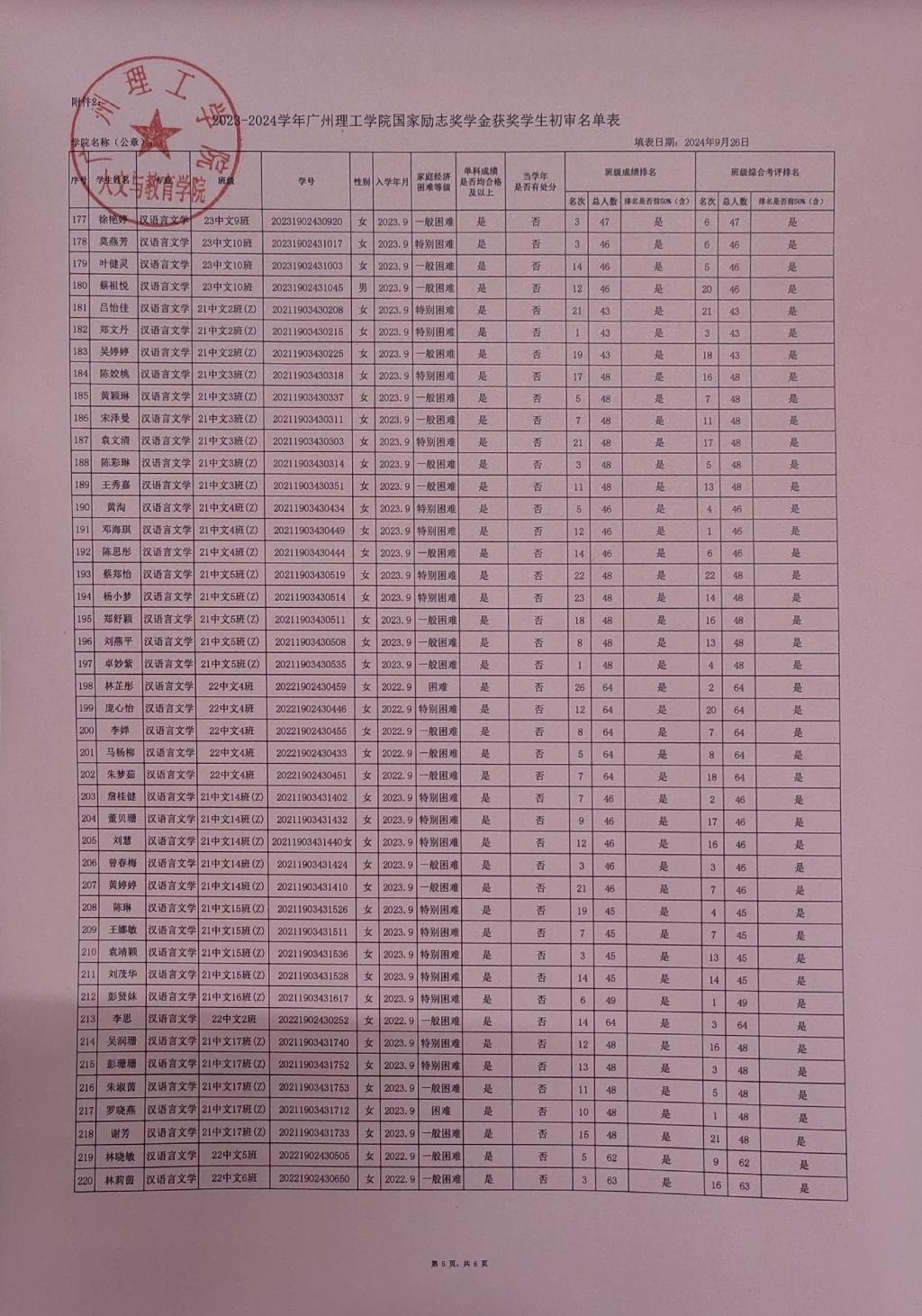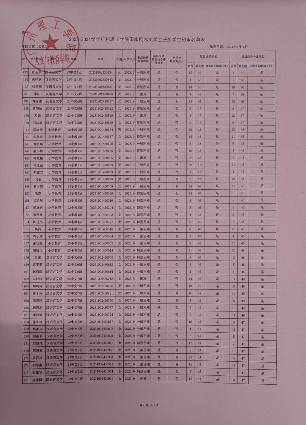 根据《关于开展2023-2024学年国家励志奖学金评选工作通知》(广州理工学助函〔2024〕14号),经学生本人申请及学院学生资助工作小组评定,现将我院2023-2024学年国家励志奖学金拟获奖初审名单在学院校园网主页、广理工文教学院公众号予以公示。公示时间从2024年9月26日至2024年9月29日止。