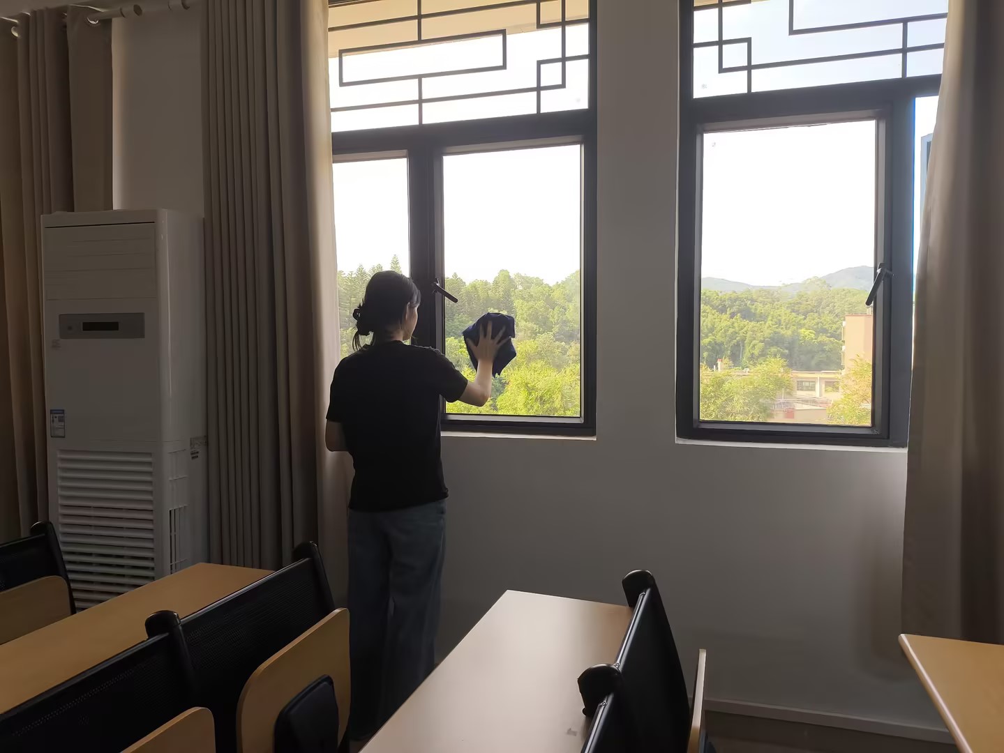 在金秋送爽的季节里,人文与教育学院积极响应国家“爱国卫生运动”号召,根据学校及学院统一部署,于2024年10月对33间责任课室开展了环境卫生大扫除和消毒活动,以进一步改善校园环境,增强师生卫生意识,弘扬爱国精神,营造美丽和谐的校园文化氛围。
