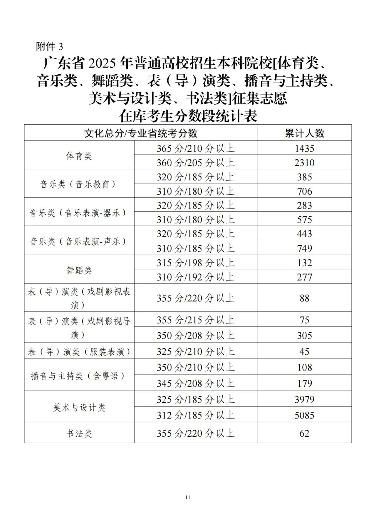 3.广东省2025年普通高校招生本科院校[体育类、音乐类、舞蹈类、表(导)演类、播音与主持类、美术与设计类、书法类]征集志愿在库考生分数段统计表