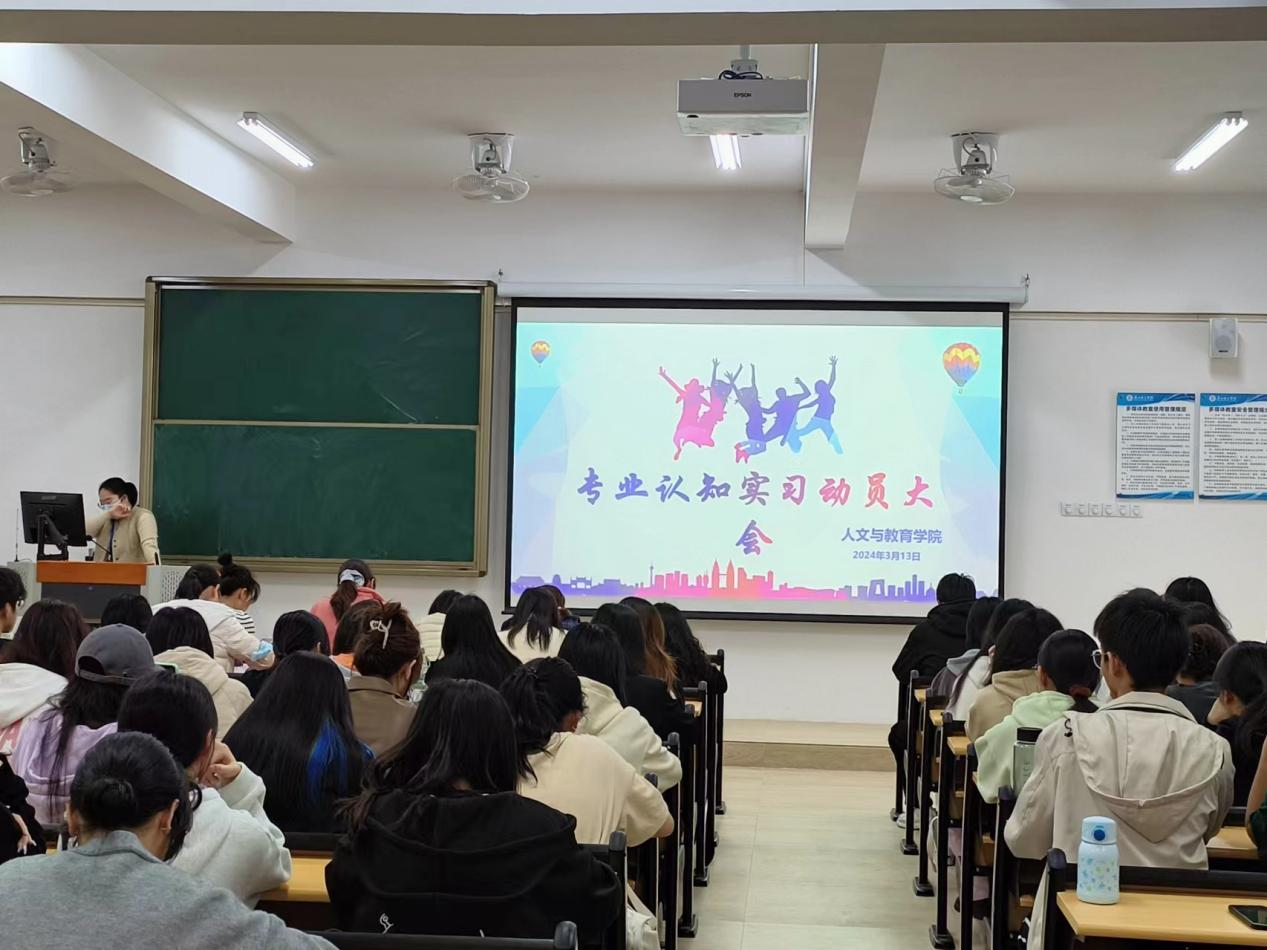 为落实我院小学教育、汉语言文学专业人才培养方案,促进学生知行合一,理论与实践相结合。我院23级小学教育和汉语言文学专业各个班级在第四周前往广州理工实验学校参加专业认知实习活动。14日下午,我院在博罗校区教学楼1栋218召开2023-2024第二学期23级小学教育和汉语言文学专业认知实习动员大会,本次大会由实习指导老师覃艳红主持,出席本次会议的有人文与教育学院荆宏侠和张丽娜老师,各班辅导员老师马飞雪、蔡怡、张惠惠、朱悦悦、刘雪婷、傅守宇,以及小学教育和汉语言文学专业75余名同学共同参加本次动员大会。