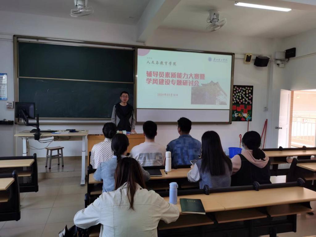 2024年3月19日,为推动辅导员素质能力大赛备赛及学院学风建设工作,人文与教育学院全体辅导员在7-402召开辅导员素质能力大赛暨学风建设专题研讨会。