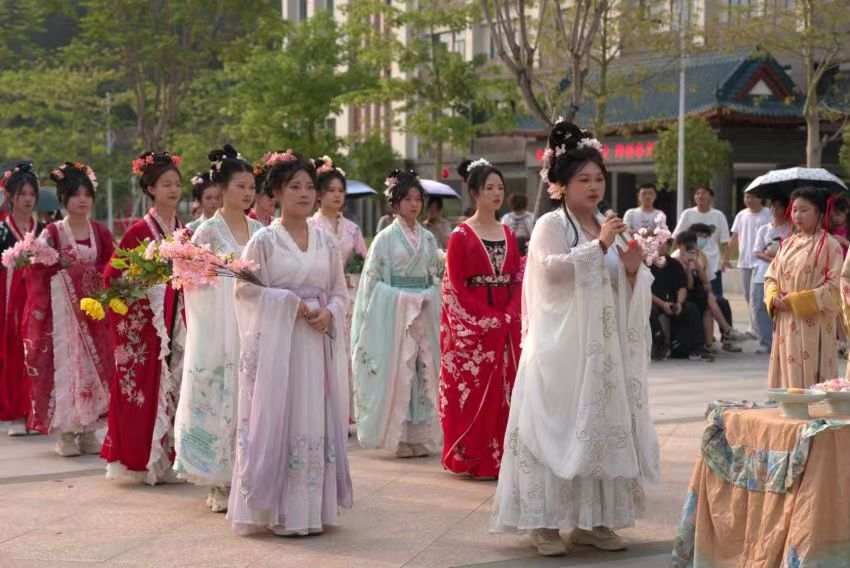 活动伊始,同学们献上了一段优美的花神祈福舞,舞姿翩翩,宛如仙子下凡。紧接着,庄严的花神祭仪式拉开帷幕。主持人身着华美汉服,以庄重的语态主持升坛仪式,为整个活动增添了浓厚的文化氛围。司奉官和执事肃立一旁,庄重地宣读祝文,向花神表达着最真挚的敬意和诚挚的祈求。紧接着,主祭与“十二花神”手持鲜花,缓缓步入祭祀场地。他们身着华服,以优雅的姿态一同行三拜之礼。随后,主祭依次进行盥洗礼、进香、进俎、献酒等仪式,并为众花神簪花悬红,饮福受昨,以此表达对春天美好生活的祝愿。