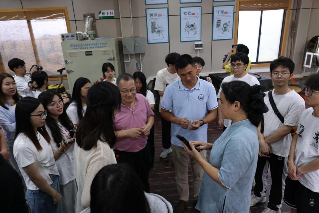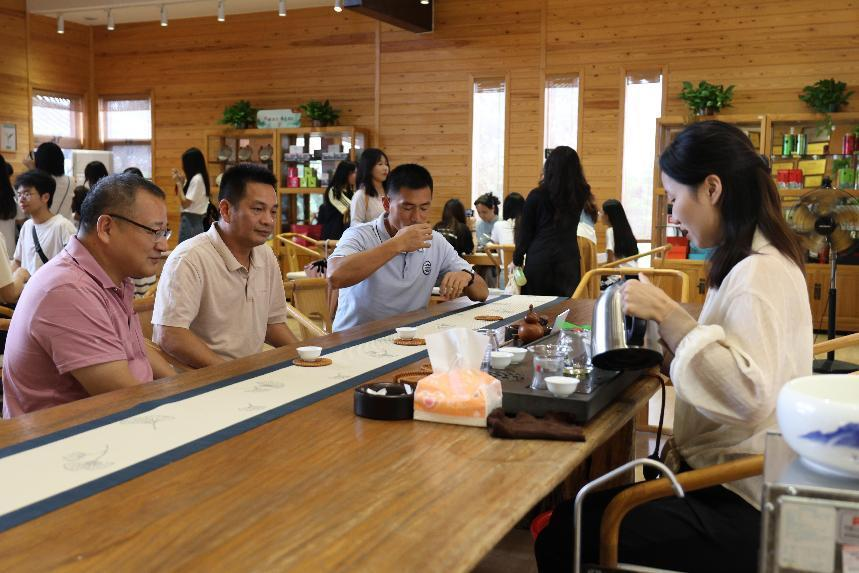 作为中国茶叶百强县,其完善的工艺流程技术也属实让人赞叹!在讲解员的带领下,我们深入了一线加工体验区感受制茶工艺,经过采青、萎凋、杀青、摊凉、揉捻、过火等六大步骤,喉韵回甘的紫金蝉茶就此诞生。老师及同学们也有幸一品香味浓郁的蝉茶,大家纷纷感叹“中国的蝉茶,世界的蜜香”这一称呼名不虚传。茶不仅仅是茶,更像是我们联系彼此的一种桥梁,而高度的文化自信和认同都能从这一小小的茶叶开展。