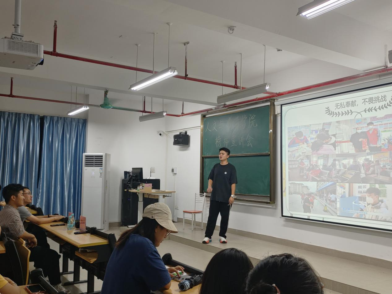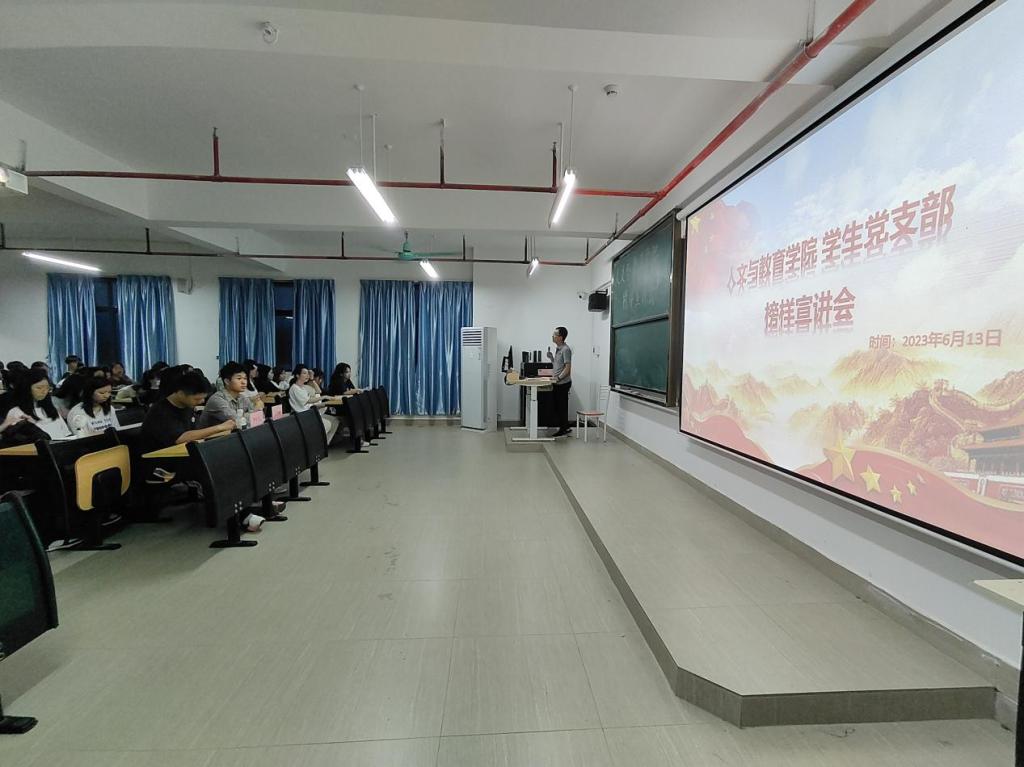 为深入学习宣传贯彻党的二十大精神,推动学习贯彻习近平新时代中国特色社会主义思想主题教育走深走实,落实立德树人根本任务,营造优良学风氛围,充分发挥优秀学子的榜样先锋示范作用,掀起看榜样、学榜样、做榜样的热潮,人文与教育学院学生党支部于6月13日晚在13栋603教室举办学生榜样宣讲活动。此次活动由党总支组织员陈新喜老师主持,学院200多名入党积极分子参加此次宣讲活动。2023年学校学生十大年度人物温岳峰和智能制造与电气工程学院团总支学生会执行主席罗宇人受邀进行榜样宣讲。