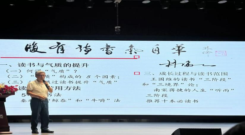 林教授首先谈到了读书与气质提升的关系,他深入剖析了气质构成的五个要素:思想品质、人文素质、个人特质、性格素质和心理素质,并强调了读书学习作为中华优秀传统文化的重要组成部分对于提升个人气质的积极作用。他提到,读书不仅能够增长知识,更能够陶冶情操,使人内外兼修,气质自然流露。接着,林教授特别介绍了“5+1”的常用读书法,并深入探讨了泛读与精读的关系。他结合散文大师秦牧的“鲸吞”与“牛嚼”法,生动地解释了泛读与精读之间的关系。林教授认为读书无定法,每个人都有自己的阅读方式。他鼓励同学们在广泛涉猎各类书籍的同时,也要注重深入研读经典著作,做到博览群书与精研经典相结合。