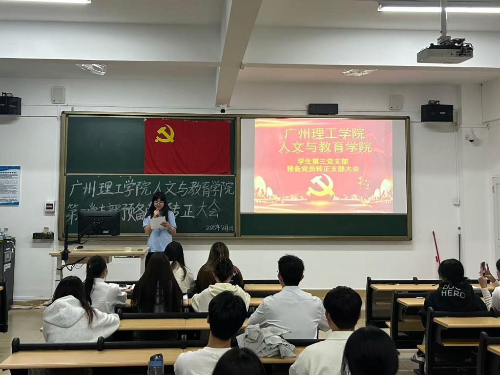 为严格履行中国共产党章程规定的组织程序,确保党员队伍的先进性和纯洁性,强化党的基层组织建设,为基层党组织注入新活力,根据党支部发展党员规范程序,广州理工学院人文与教育学院学生第三党支部于2025年12月1日19:00,在白云校区7栋501教室召开预备党员转正大会。