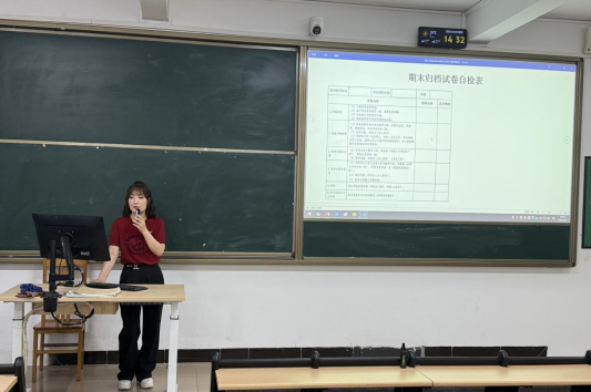 郭敏主任在会上详细解读了试卷整改条例,强调了课堂纪律的三个关键方面:抬头率、前排就坐率和到课率。她指出,这三项指标是评估课堂教学质量的重要参考,也是本科教学工作合格评估中的重点考察内容。郭敏主任还特别强调了磨课工作的重要性,要求全体教师积极参与磨课活动,通过集体备课、互相听课、教学研讨等方式,不断提升教学水平,确保课堂教学质量符合评估要求。她表示,试卷整改工作必须严格按照学校规范执行,包括命题科学性、批改规范性、分析全面性和归档完整性等方面,为迎接本科教学工作合格评估打下坚实基础。