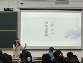 在示范课环节,荆宏侠老师以“《茶馆》的艺术特色”为题进行精品示范教学。荆老师从创作背景切入,系统阐述了该剧自1957年首次刊载至80年代成为国际公认经典的历程,重点分析其三大艺术特色:一是独特的艺术构思,以茶馆作为小社会缩影,通过小人物的生活变迁折射时代风云;二是散点透视式的戏剧结构,借鉴中国长卷绘画的视角转换,呈现丰富叙事层次;三是非冲突化的戏剧思维与悲喜剧美学,矛盾聚焦于小人物与大时代之间的张力,语言开口即见性格,悲剧主调中穿插喜剧因素,引发深层反思。