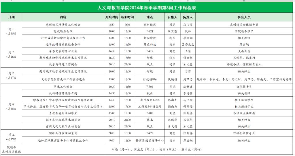 人文与教育学院2024年春季学期第8周工作周程表
