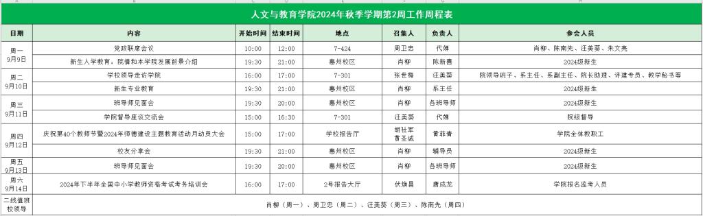 人文与教育学院2024年秋季学期第2周工作周程表