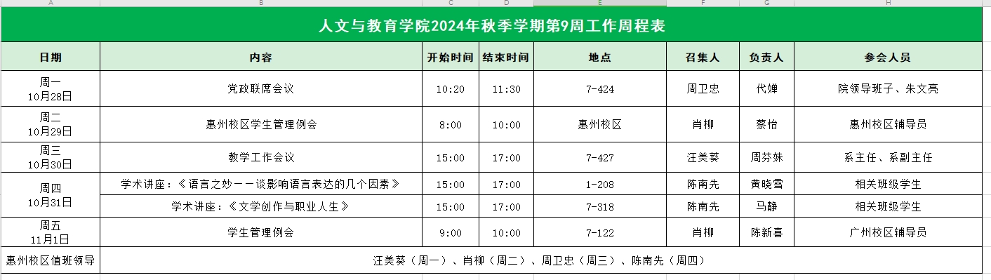 人文与教育学院2024年秋季学期第9周工作周程表