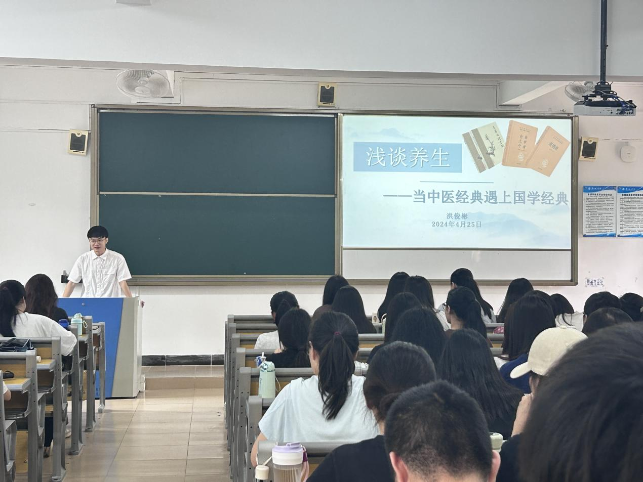 2024年4月25日,为进一步提高同学们的健康意识,养成良好的生活习惯。人文与教育学院21中文16、17班(Z)在6栋415举行了一场以“浅谈养生 当中医经典遇上国学经典”为主题的学术讲座。本次学术讲座邀请了洪俊彬博士作为活动主讲嘉宾,由辅导员杨宁老师精心组织。